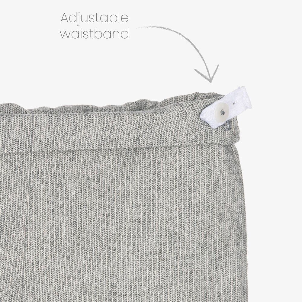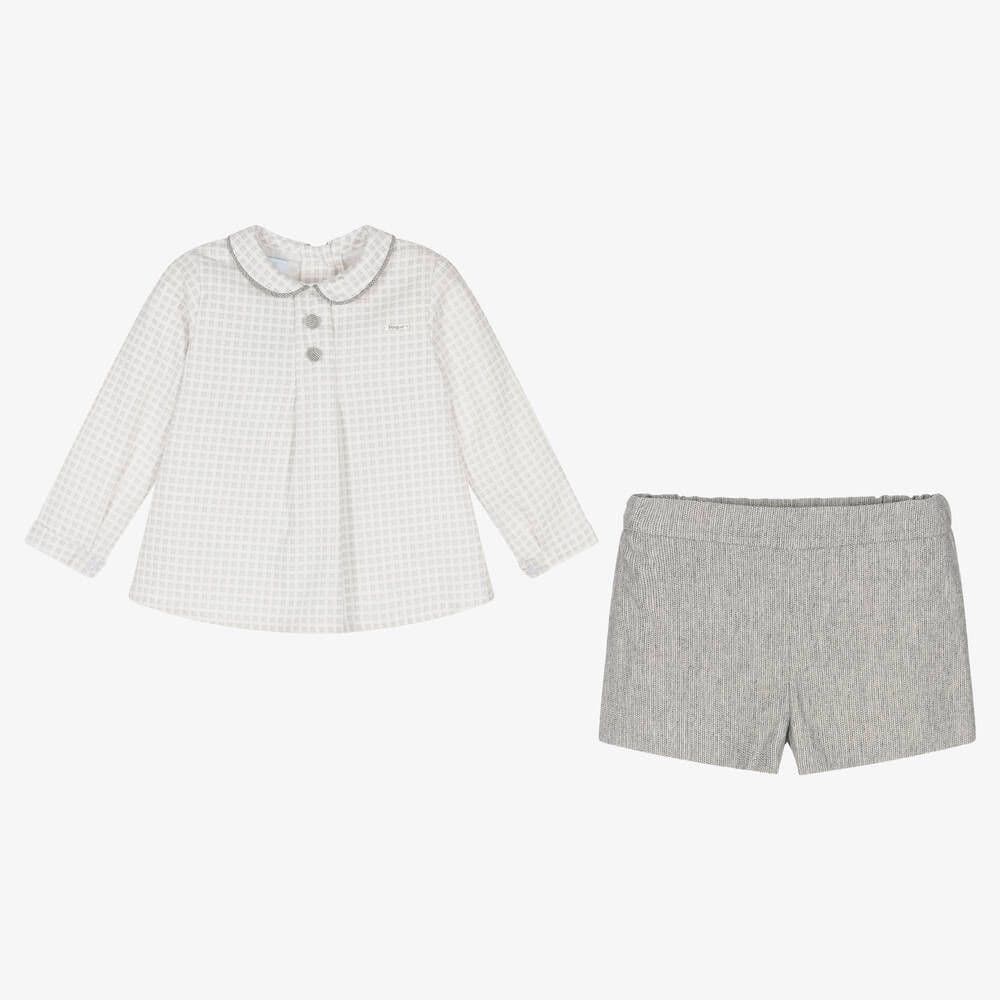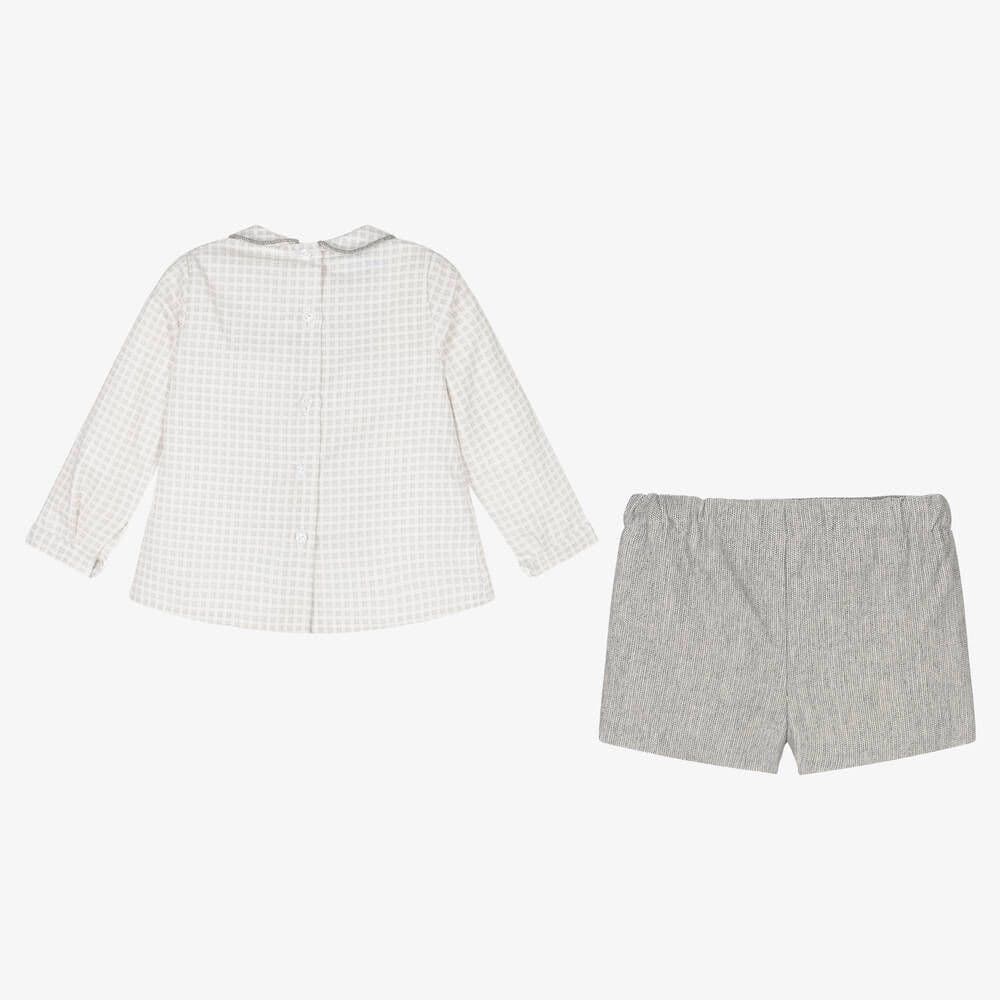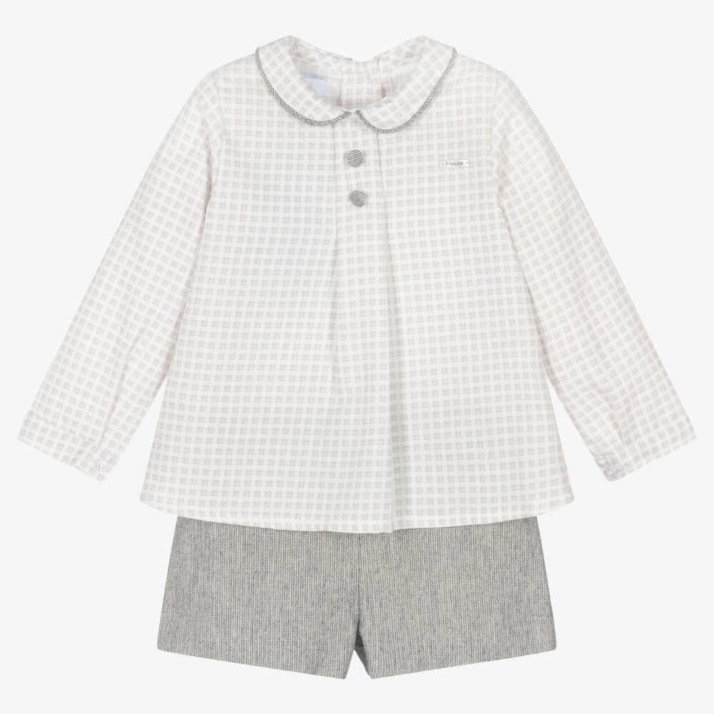 Smart white and grey shirt and shorts set for younger boys from Spanish brand, Foque. The soft cotton blend shirt has a lovely checked pattern, with a rounded collar, decorative buttons and a logo plate on the chest. It has a box pleat on the front for a relaxed fit and button fastenings on the back and cuffs. The soft brushed cotton shorts have a tiny herringbone pattern and a comfortable, lightweight lining. An easy-to-wear slip-on style, they have an adjustable waistband for a great fit.