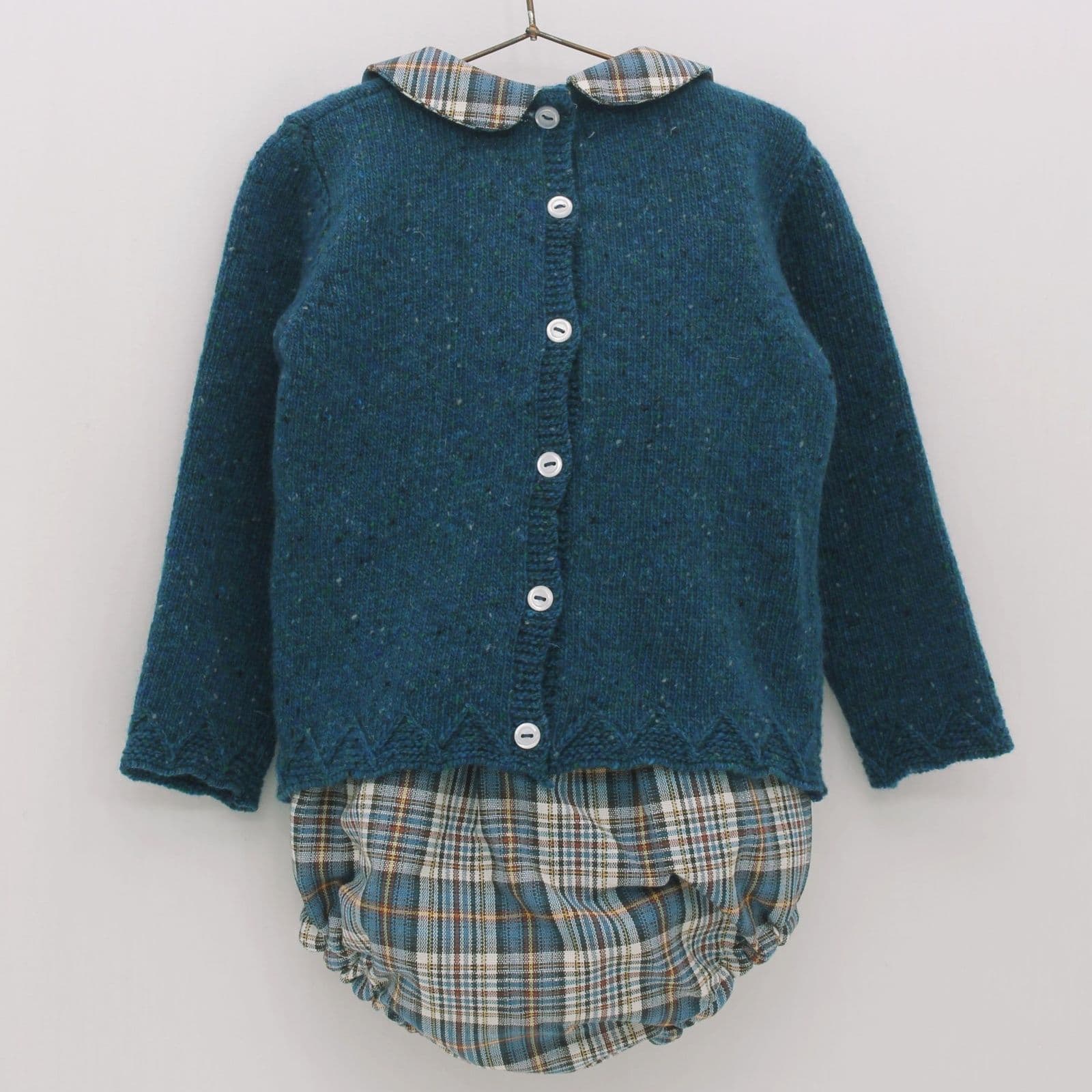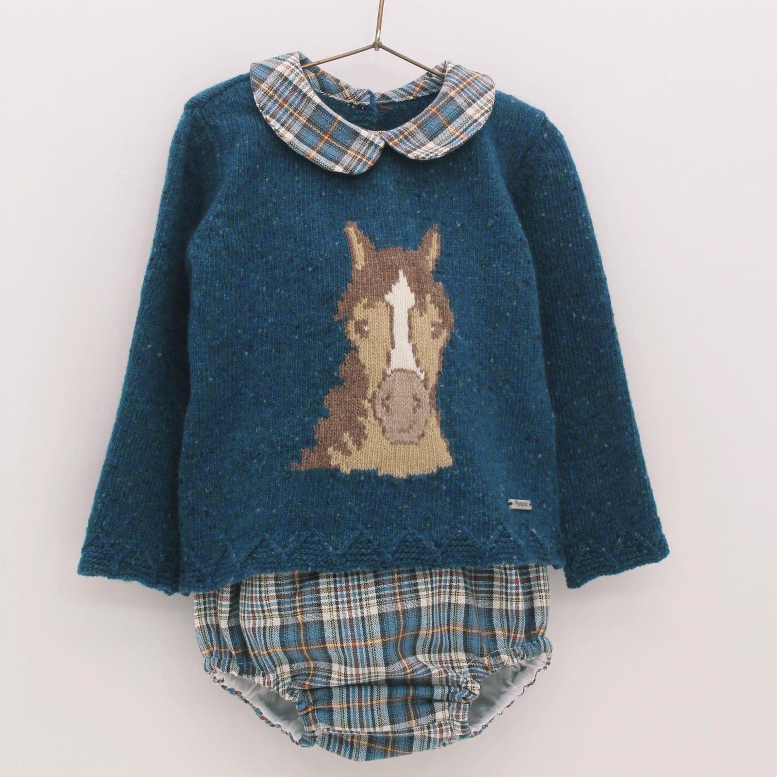 Baby boy's knit outfit set from Spanish brand Foque's Autumn/Winter '23 collection. Petrol blue marl wool-blend knitted long sleeve top with horse motif to the chest and stylish tartan collar, paired with matching tartan jam pants.