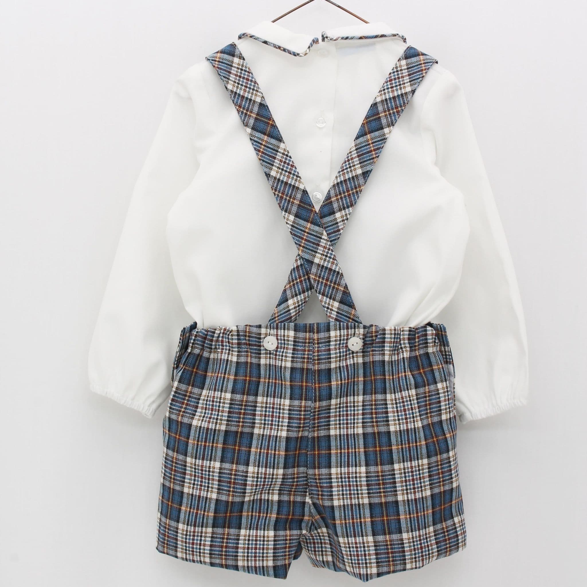 White long sleeve collared shirt underneath stylish petrol blue tartan shorts with braces.