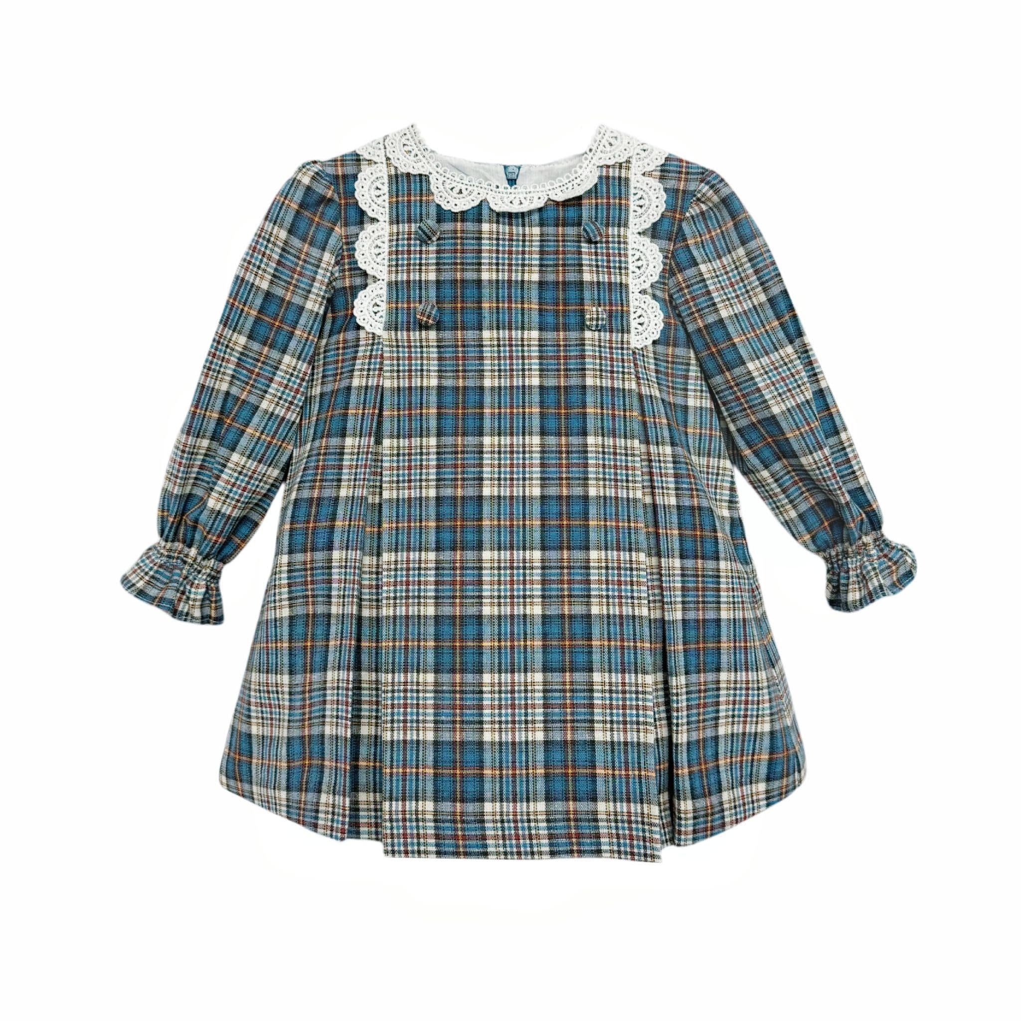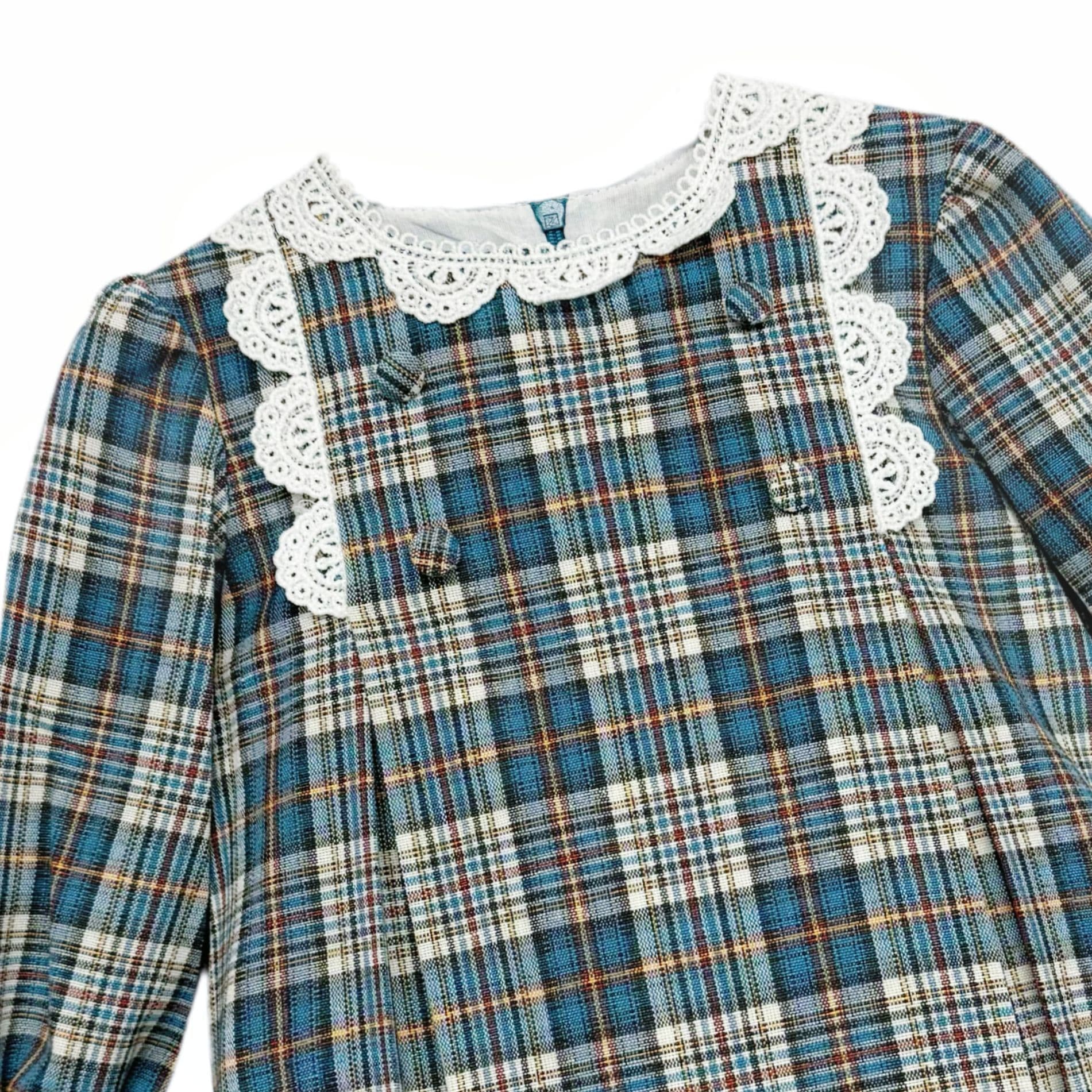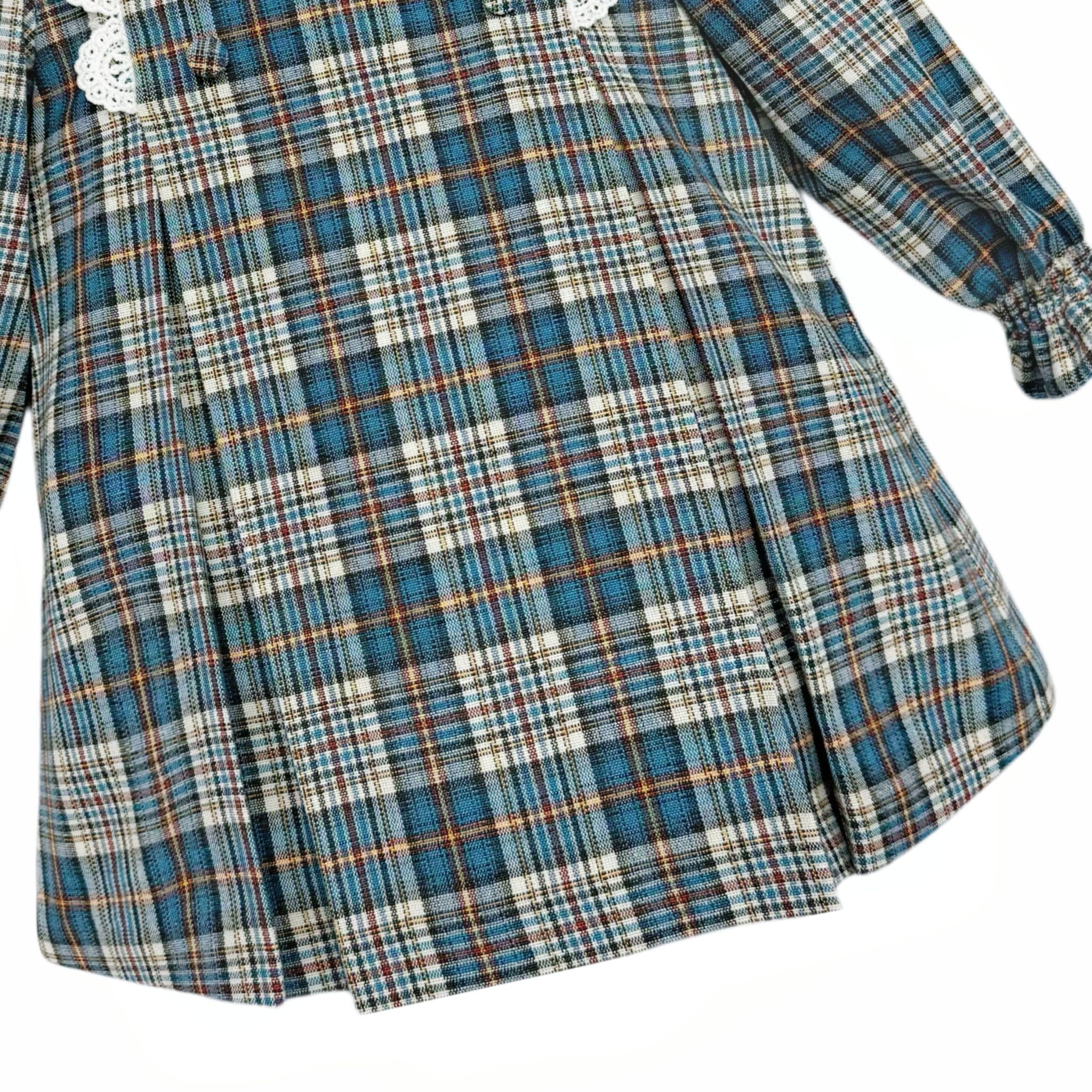 From Spanish brand Foque, a checked dress for little girls in blue, ivory and red. Made in a softly woven cotton-blend fabric and fully lined, this lovely traditional style has a delicate ivory lace collar, decorative buttons and a small logo plate on the bodice. The long sleeves are puffed at the shoulders and have gently elasticated ruffled cuffs, and the skirt is gathered for a feminine finish. The dress fastens with buttons on the back and pairs with matching knickers to complete the look.